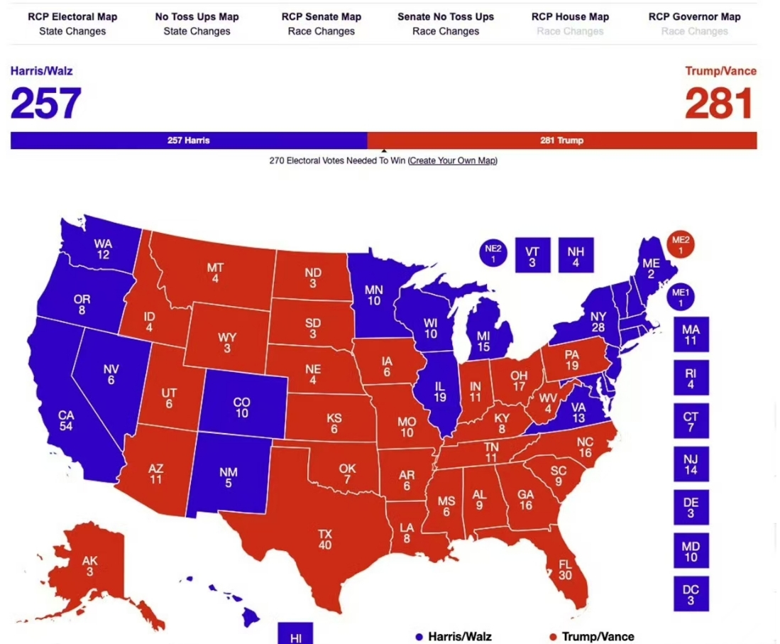 “RealClearPolitics”網站根據民調支持率生成的的選舉人票圖顯示,特朗普相當於已經拿到了281票,也明顯領先於哈里斯的257票。這些數據在10天之前還都是反過來的。另一個相對較為公平公正的是美國的博彩市場,信息顯示博彩市場顯示對唐納德·特朗普的支持急劇增加。