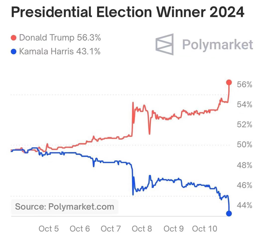 但是自從10月5日以來,特朗普的支持率開始逐漸快速增加,而哈里斯則在快速下降。目前唐納德·特朗普現在在號稱很公平的Polymarket的總統選舉預測中領先卡馬拉·哈里斯(Kamal Harris)超過13%。特朗普支持率快速攀升到了56%,而哈里斯快速下降到了43%。