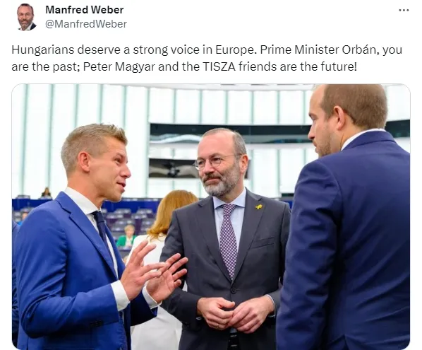 韋伯聲稱歐爾班“已成為過去式”,匈牙利反對黨領袖彼得·毛焦爾(Peter Magyar)才是未來。