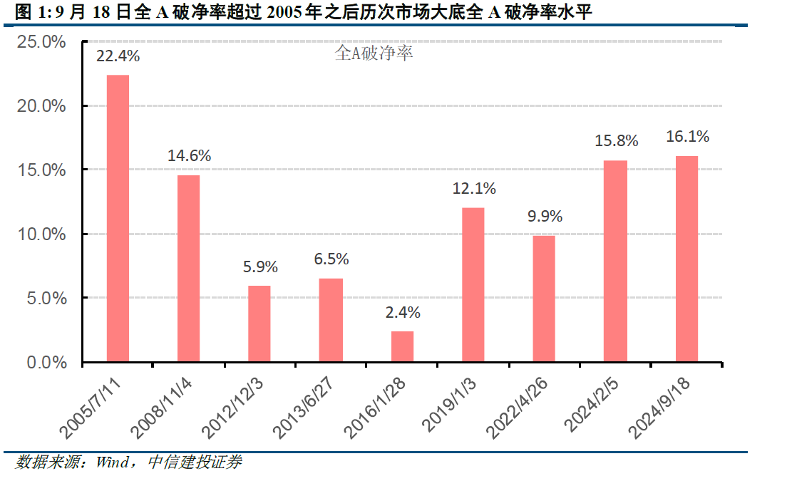 縱向來看,截至9月18日,全A破淨率高達16.1%,超過了2005年之後歷次市場大底全A 破淨率水平。