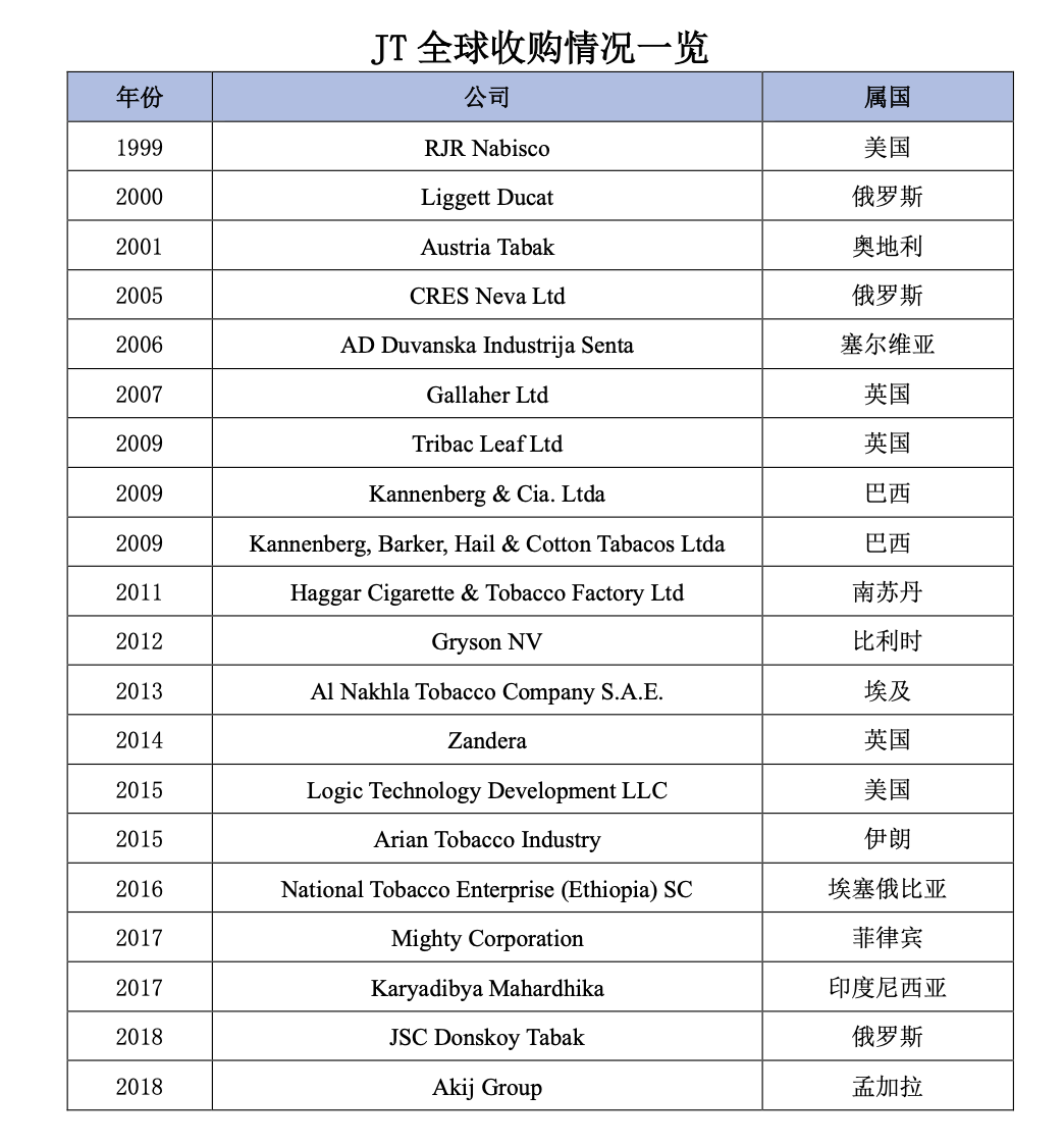 所謂的國際化,主要是指1999年之後,JT在全世界範圍通過數十次的收購,使自己成為全球第三代煙草企業。具體可以通過下表看看JT是如何成為全球範圍煙草併購狂人的。