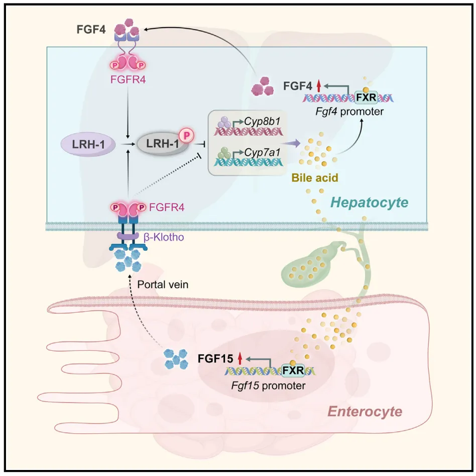 膽汁酸(BAs)對消化和吸收親脂性營養物質至關重要,也作為調節代謝和能量穩態的信號分子。BA穩態或相關信號通路的破壞可導致膽汁淤積、肝膽損傷和代謝紊亂。BA穩態的維持部分是通過負反饋機制和時空控制的腸肝循環。BA合成的調控主要依賴於肝和腸中的法尼脂類X受體(FXR, NR1H4)的激活,該受體感知BA水平並控制與BA合成、轉化、運輸和信號傳導相關基因的轉錄。研究表明,在餐後腸內BAs增加的情況下,激活的FXR可促進肝臟中小異源二聚體伴侶(SHP)或v-maf禽類肌肉筋膜性纖維肉瘤癌基因同源物G (MAFG)的轉錄和迴腸中成纖維細胞生長因子15(FGF15,人FGF19)的轉錄。分泌的FGF15/19選擇性結合並激活肝臟FGF受體4 (FGFR4)-β-klotho (KLB)複合物,啓動一個不完全瞭解的途徑,最終導致Cyp7a1和Cyp8b1的轉錄抑制,這兩個基因編碼肝臟BA合成的關鍵酶。