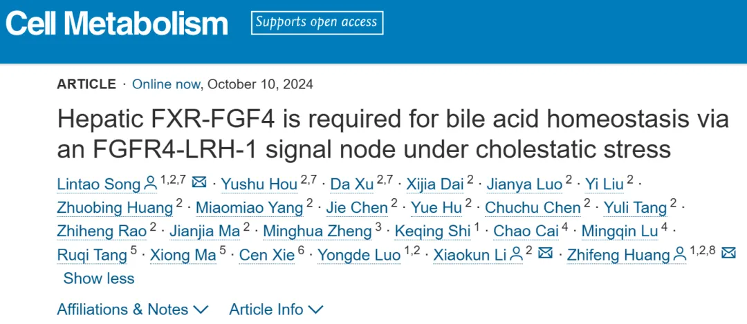 2024年10月10日,温州醫科大學李校堃、黃志鋒、宋林濤共同通訊在Cell Metabolism(IF=27.7)在線發表題為“Hepatic FXR-FGF4 is required for bile acid homeostasis via an FGFR4-LRH-1 signal node under cholestatic stress”的研究論文,該研究發現肝臟FXR-FGF4是在膽汁淤積應激下通過FGFR4-LRH-1信號節點維持膽汁酸穩態所必需的。