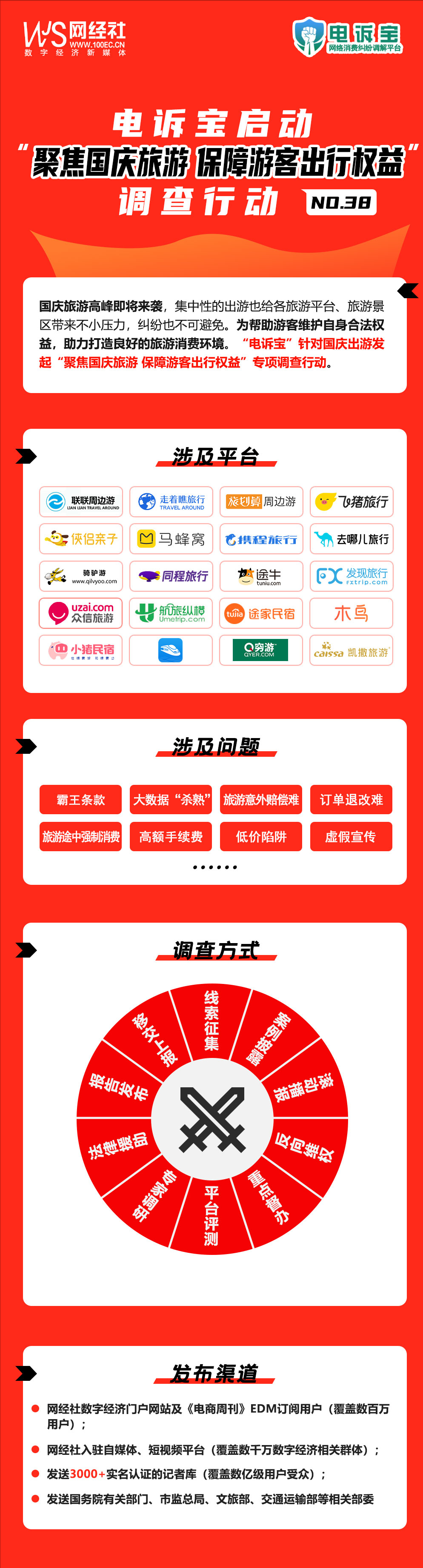 為幫助遊客維護自身合法權益,助力打造良好的旅遊消費環境。網經社旗下消費糾紛調解平台“電訴寶”發起“聚焦國慶旅遊 保障遊客出行權益”專項調查行動。據悉,這也是今年繼發起“電商平台‘僅退款’調查行動”後,面向國慶期間在線旅遊的專項調查行動,也是電訴寶的第38次專項調查行動。