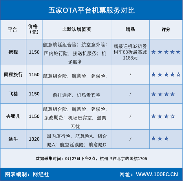 國慶出遊五家OTA機票評測:攜程增值服務多樣 途牛最貴_風聞