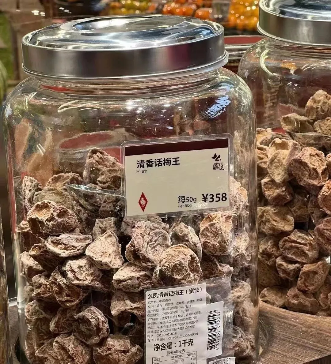 而這一斤就要普通人一個月工資的天價話梅就是來自於知名香港蜜餞品牌“麼鳳士多”,在這家被稱為“話梅界的愛馬仕”的品牌中,涼果製品例如梅乾、薑糖都貴到離譜,甚至被不少消費者吐槽:感覺是鑲了金邊的果乾。如此昂貴的價格也讓很多人開始好奇,這些話梅不説物超所值,真的能做到物有所值嗎?如今的果乾難道也都和這個品牌一樣貴嗎?