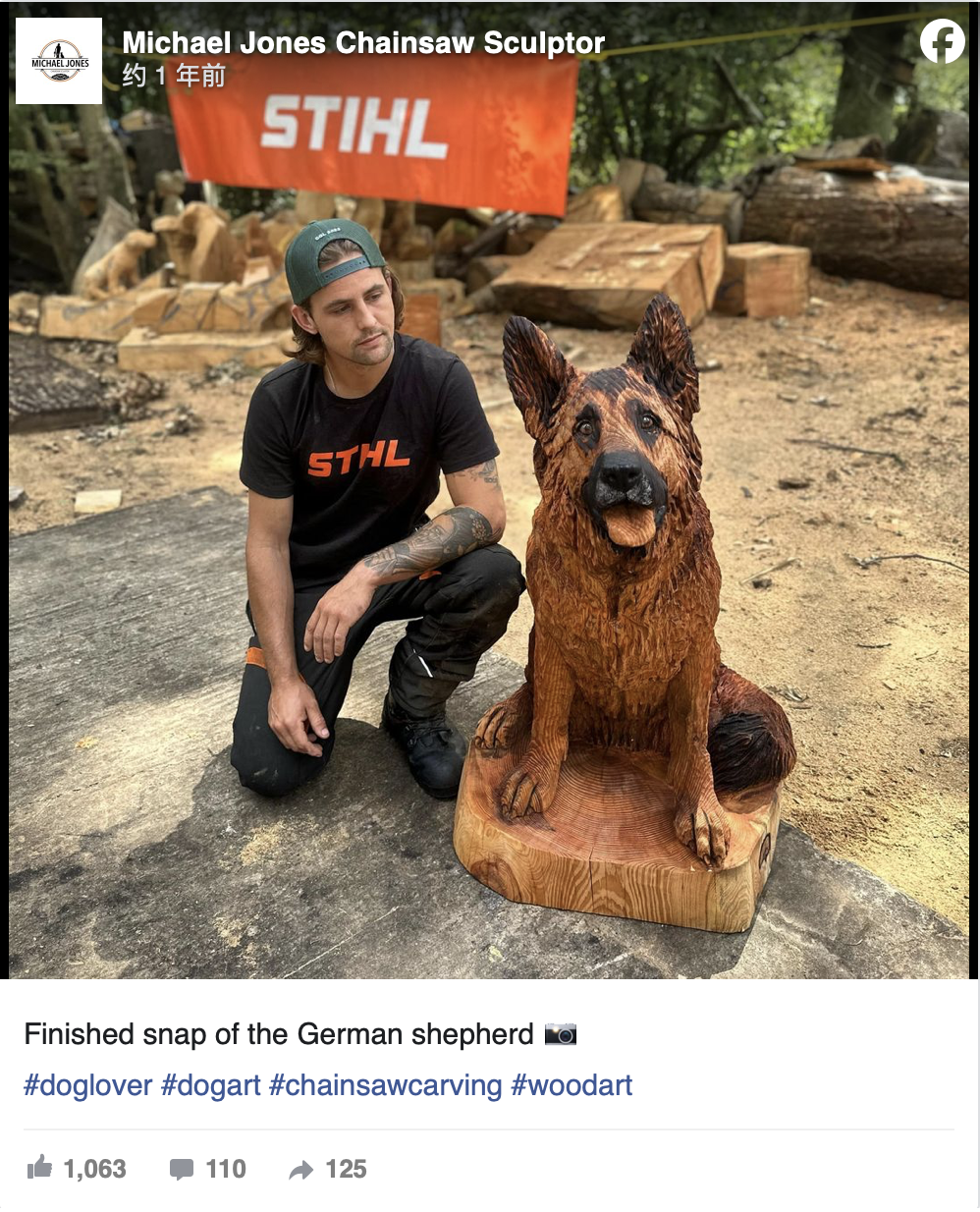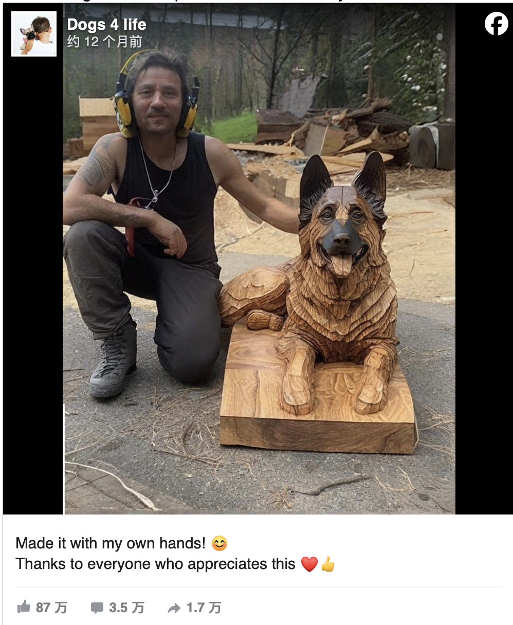 而餵給 AI 的原圖,則是一個木雕藝術家 Michael Jones 和他創作真實存在的木雕狗,Jones 的原帖只獲得了 1063 個贊,110 條評論,與 AI 假帖相去甚遠。