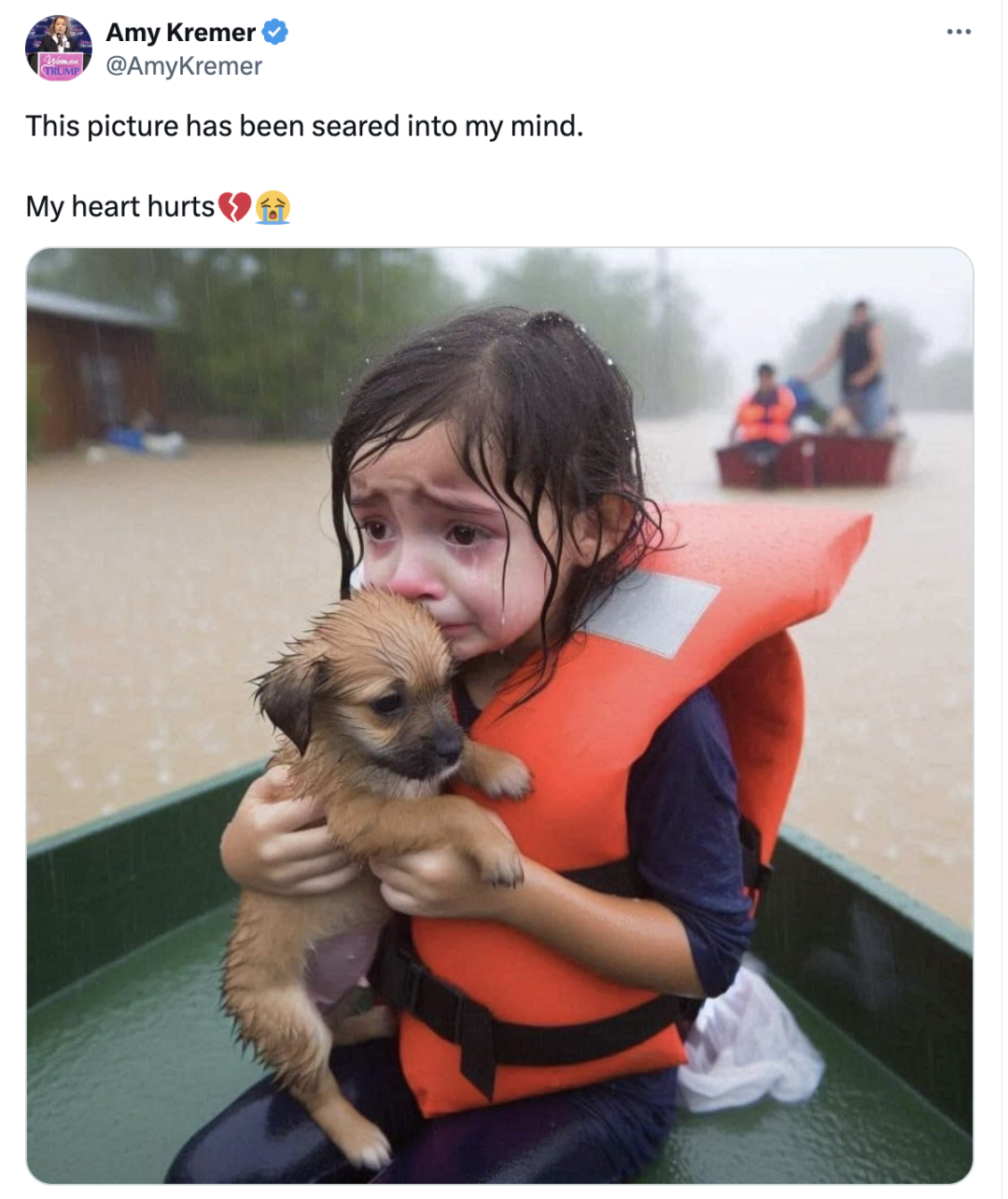 在被評論區的人指出「假圖」之後,Kremer 直接發文開懟稱「是啊,我是不知道這張照片是從哪來的,説老實話,哪兒來的無所謂。它已經永遠烙印在我的腦海中了,有些人比這張照片所顯示的經歷還要糟糕得多。它象徵着人們現在正在經歷的創傷和痛苦。」換言之,她知道這張圖片是假的,但她不在乎,因為她的目的不在於同情這位「AI 女孩」,而是攻擊執政黨應對「海倫妮」颶風的失責。