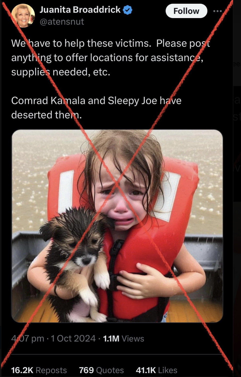 AI 假圖片已經成了黨派之間相互掣肘的政治工具,伴隨着這張照片一同傳播的還有各種陰謀論和假新聞,諸如「聯邦緊急事務管理局正在準備把災民財產充公」「當局在控制共和黨支持州(颶風受災州多為支持共和黨的(紅州)天氣」。