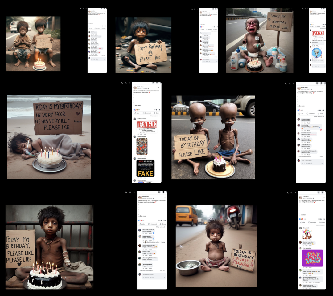 8 月由斯坦福互聯網實驗室發佈的論文《垃圾內容和騙子如何在 Facebook 上利用人工智能生成的圖像來增加受眾》也在測試中發現,他們用 AI 生成的圖像總共獲得了數億次曝光。AI 生成的圖文帖通常是標題黨配合奪人眼球的圖片,比如一個斷腿的小孩子舉着牌子説「祝我生日快樂」就能收穫 7 萬點贊和 3000 條評論。用户的評論也能顯示出他們並沒有意識圖片是由 AI 生成。