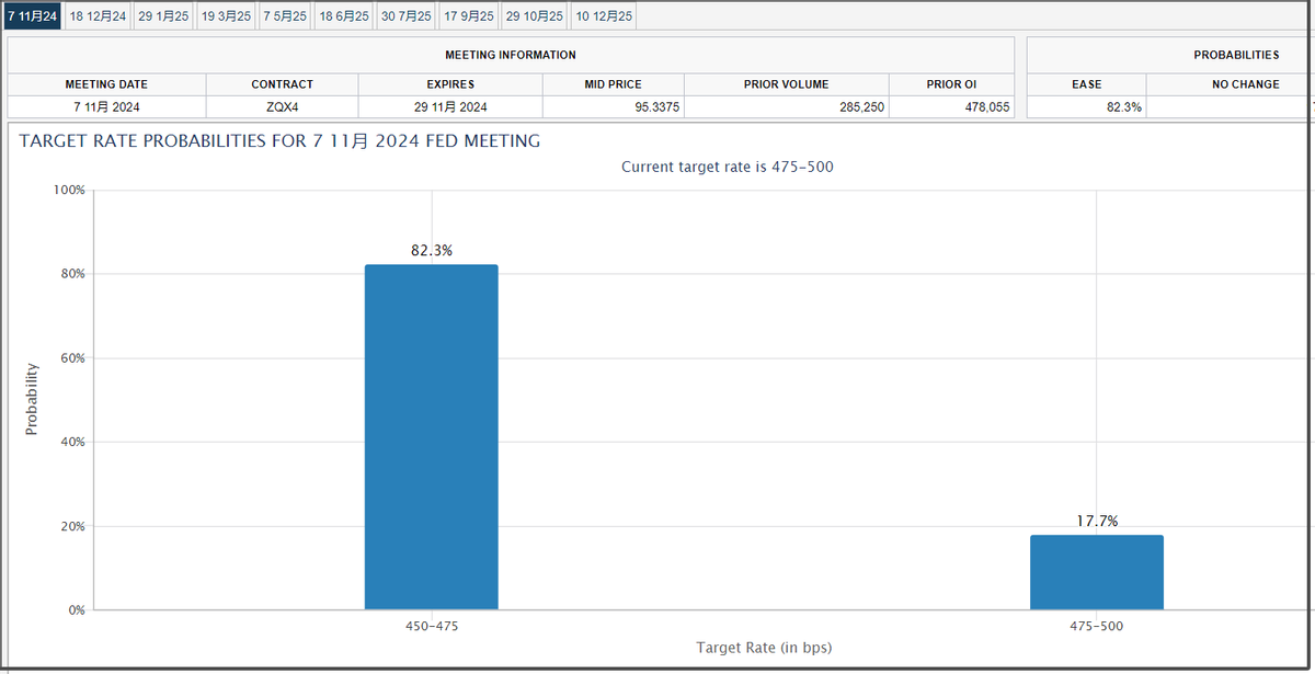 在這份通脹數據公佈後,芝商所的美聯儲觀察工具顯示,市場預期11月降息25基點的概率為82.3%,並沒有發生太大的變化。