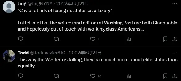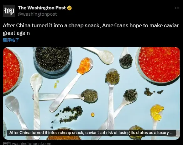 “‘魚子醬有可能失去其奢侈品地位’哈哈,這告訴我《華盛頓郵報》的作者和編輯都有精英情節,與美國老百姓完全脱節……”