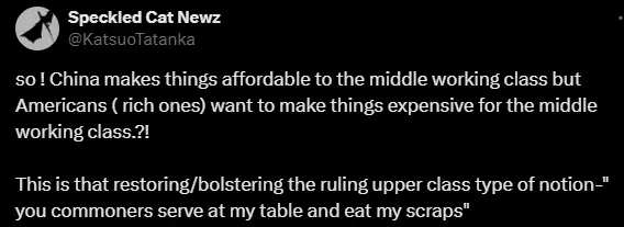“所以!中國製造大家都能吃得起的東西,但是美國有錢人只想要生產更貴的東西給中產?這就是他們的根本理念——‘你們這些平民只配給我端盤子,吃我的殘羹剩飯’”