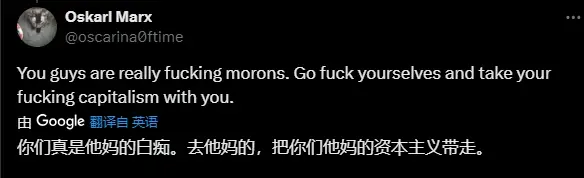 “你們這幫他X的弱智。把你們X蛋的資本主義帶着麻溜滾。”