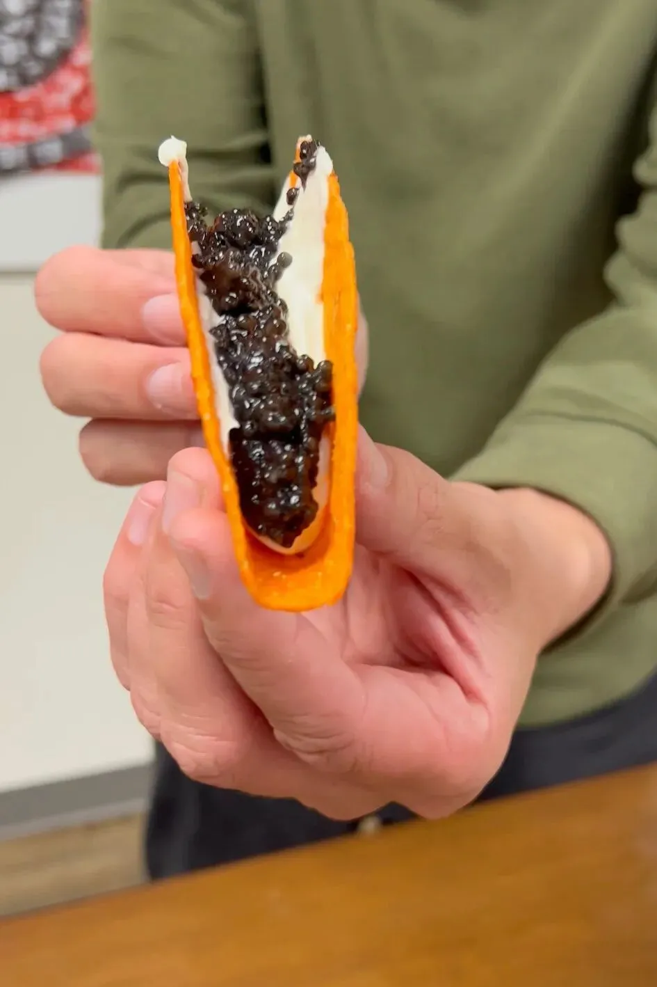 一口爆漿,嘎嘣脆,美滋滋。魚子醬成為了蘸料。