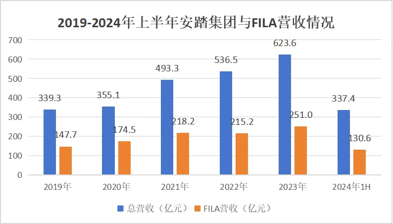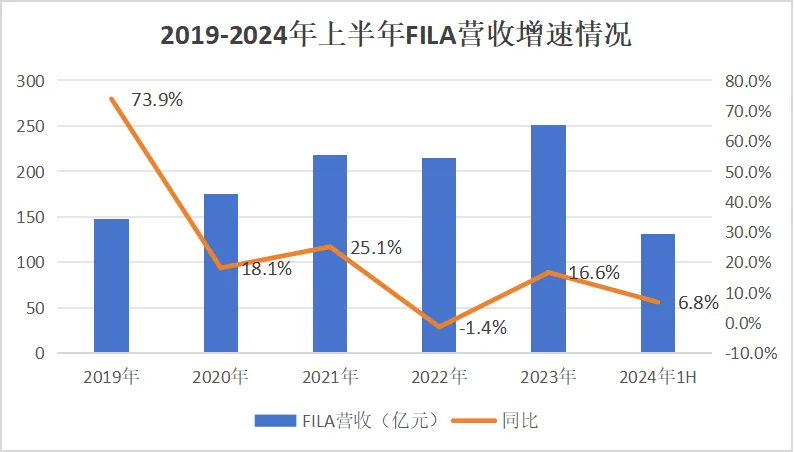 FILA的失速陰雲從2022年就已籠罩,這一年,FILA首次出現年度營收下滑,雖然其營收增速在下一年有所回升,但整體依然處於頹勢。今年上半年,安踏收入同比增長13.8%至337.4億元,創史上最佳中期業績。其中,FILA貢獻130.6億元,增速僅為6.8%。