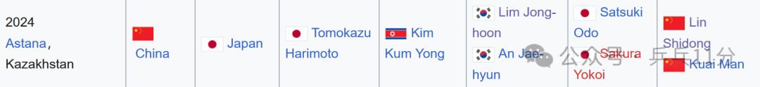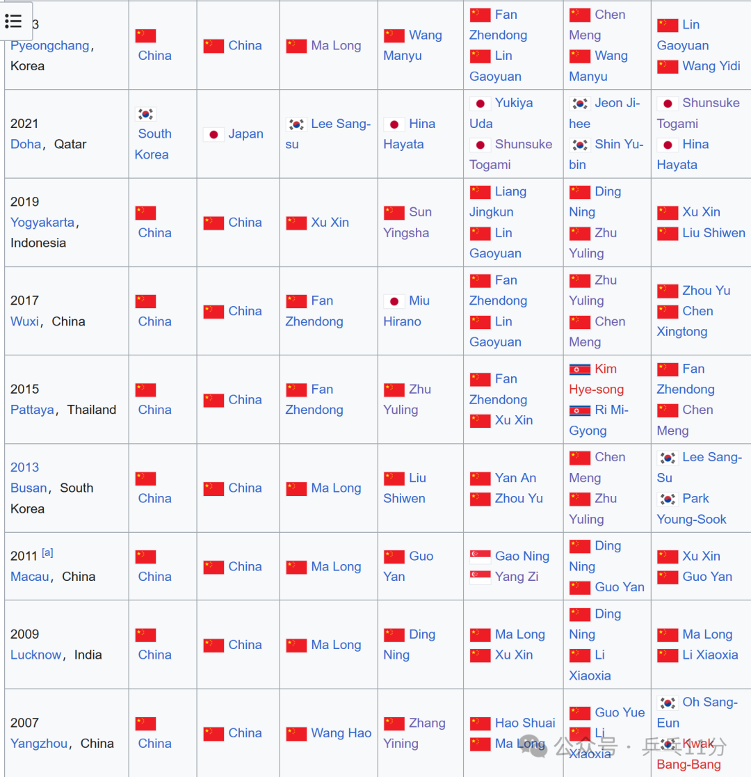 不用具體看誰贏了什麼,只要看一下這個獎牌榜的大致國旗顏色就行了——2021年沒有中國,不是因為輸球,是因為中國沒有參賽。