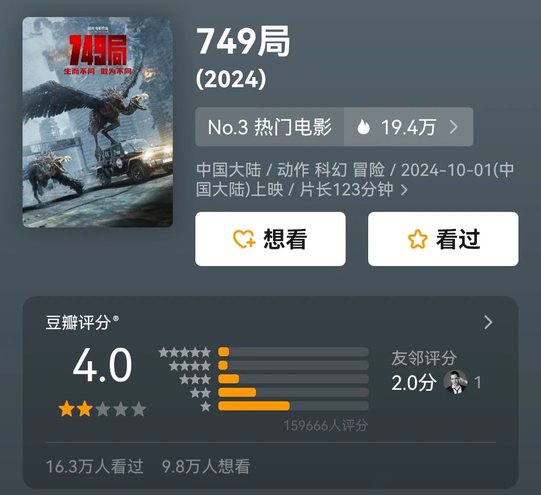 《749局》豆瓣評分已跌到了4.0分,且仍在持續走低。