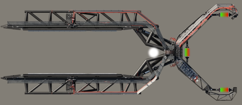 “筷子”機械臂如圖12所示,為雙叉臂結構,可以沿發射塔架上下移動,也可以沿中間縱軸轉動,可以對超重助推級和星艦飛船進行升降、總裝等操作。在超重助推級返回時,充當捕獲裝置,將其捕獲,確保安全可控着陸,並實現快速週轉發射。“筷子”包括擺臂(下圖左側)和托架(下圖右側):擺臂用於在總裝或返回過程中,為超重/星艦提供支撐;托架用於將“筷子”固定在發射塔架上,並能夠使“筷子”沿着塔架上下滑動。