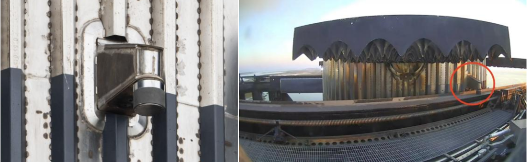 圖5 一級長排罩處出現結構破損,臍帶接口處有起火