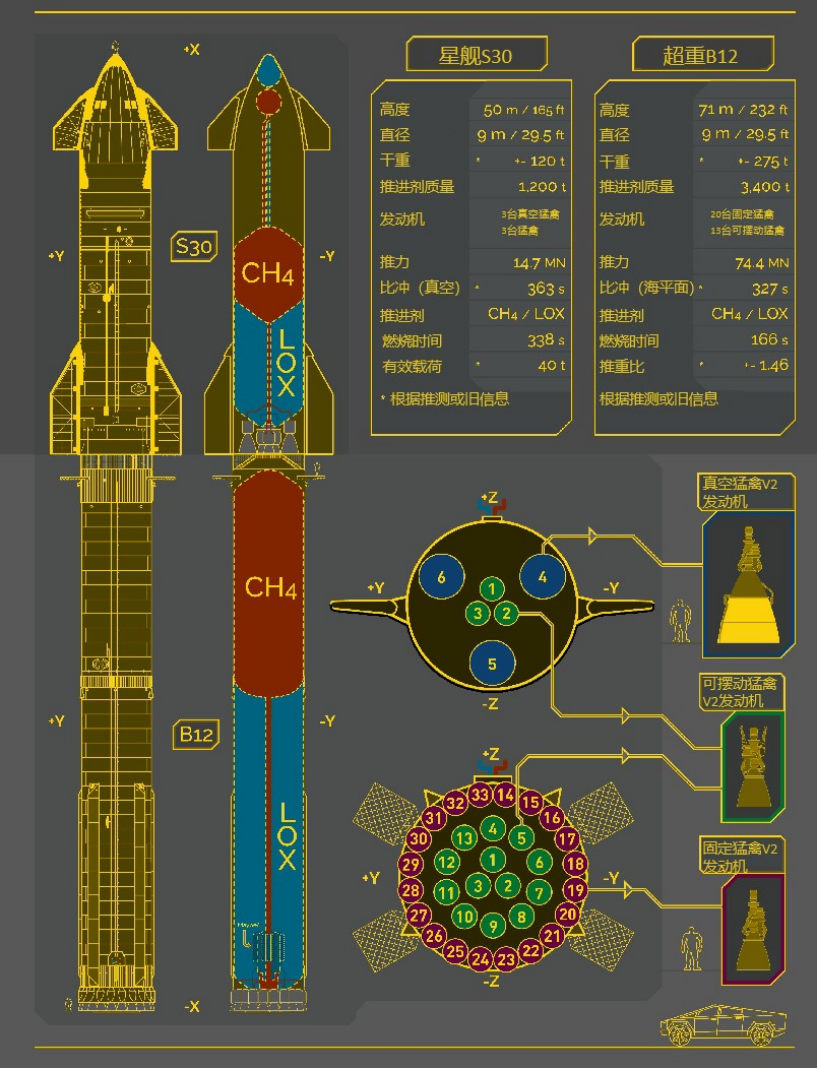 B12/S30組合體全長121米,超重B12高71米,星艦S30高50米,推進劑質量4600噸,B12乾重275噸,S30乾重120噸。採用二代猛禽發動機(猛禽V2)。