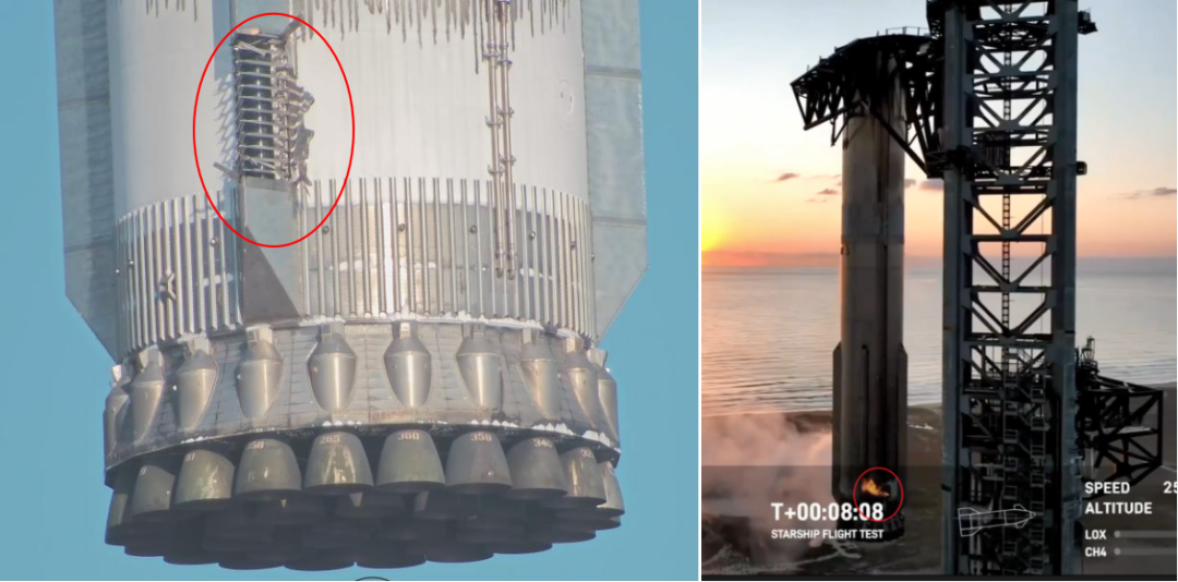 返回後的一級的長排罩處有結構破損,可能是由於發動機產生熱羽流衝擊或氣動力造成的。另外,在一級底部的臍帶接口處有比較明顯的起火故障。