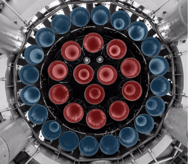 起飛後約6分37秒,一級中圈10台猛禽發動機關機,僅保留中心3台發動機工作,中圈10台工作時長約7秒。此時高度小於1千米,速度為247千米/小時;