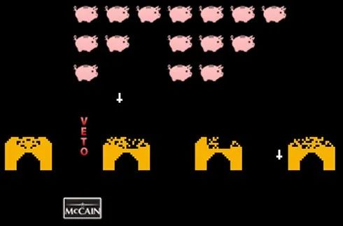 比如更早的2008年美國大選,奧巴馬的競爭對手約翰•麥凱恩,其競選團隊就仿照經典遊戲《太空侵略者》,自己做了一款名為《豬肉侵略者》的像素小遊戲: