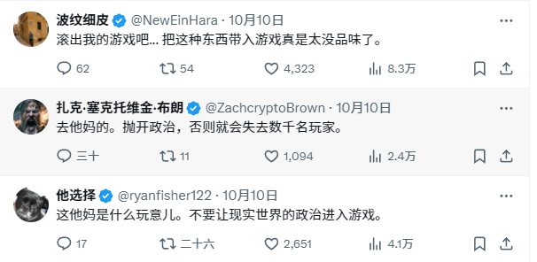而在社交網絡上,這種“一邊政治一邊遊戲”的行為確實吸引了許多人的討論和關注,但熱度最高的幾條評論,態度卻出奇的一致: