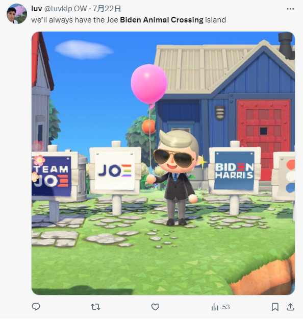 先不説遠的,現任美國總統拜登在四年前的競選期間,同樣利用了當時大熱的遊戲《動物森友會》來為自己增加影響力。