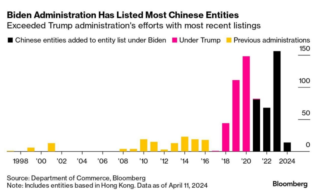 在拜登任期內,**美中技術競爭愈演愈烈,拜登還沿用了特朗普的政策,限制中國獲取關鍵技術。**特朗普政府通過出口管制限制了對中國5G計劃至關重要的敏感技術轉移,拜登則將其擴大到半導體等其他敏感技術。到2024年4月,拜登時期添加到美國商務部“實體清單”的中國公司數量(拜登任內319家)超過了特朗普任內的數量(306家)。