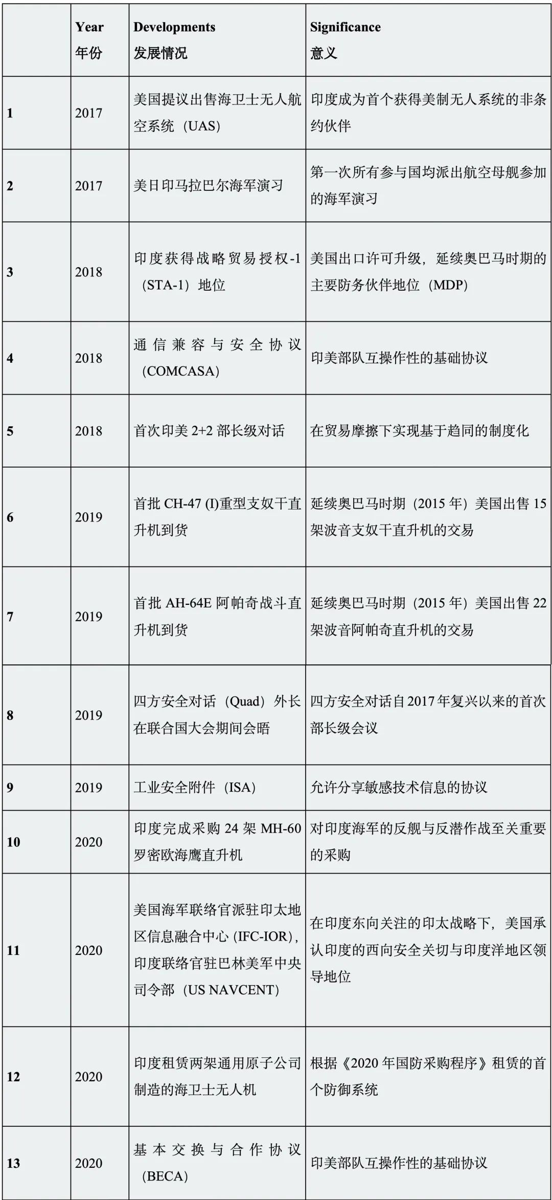 **印度和美國在技術合作方面無論是在形式還是功能上都取得了提升。**在特朗普執政期間,印美逐步敲定了包括部隊互操作協議在內的基礎性協議,為兩國處理敏感技術奠定了必要框架。特朗普政府還見證了美國對印武器出口指定方面的重要先例。