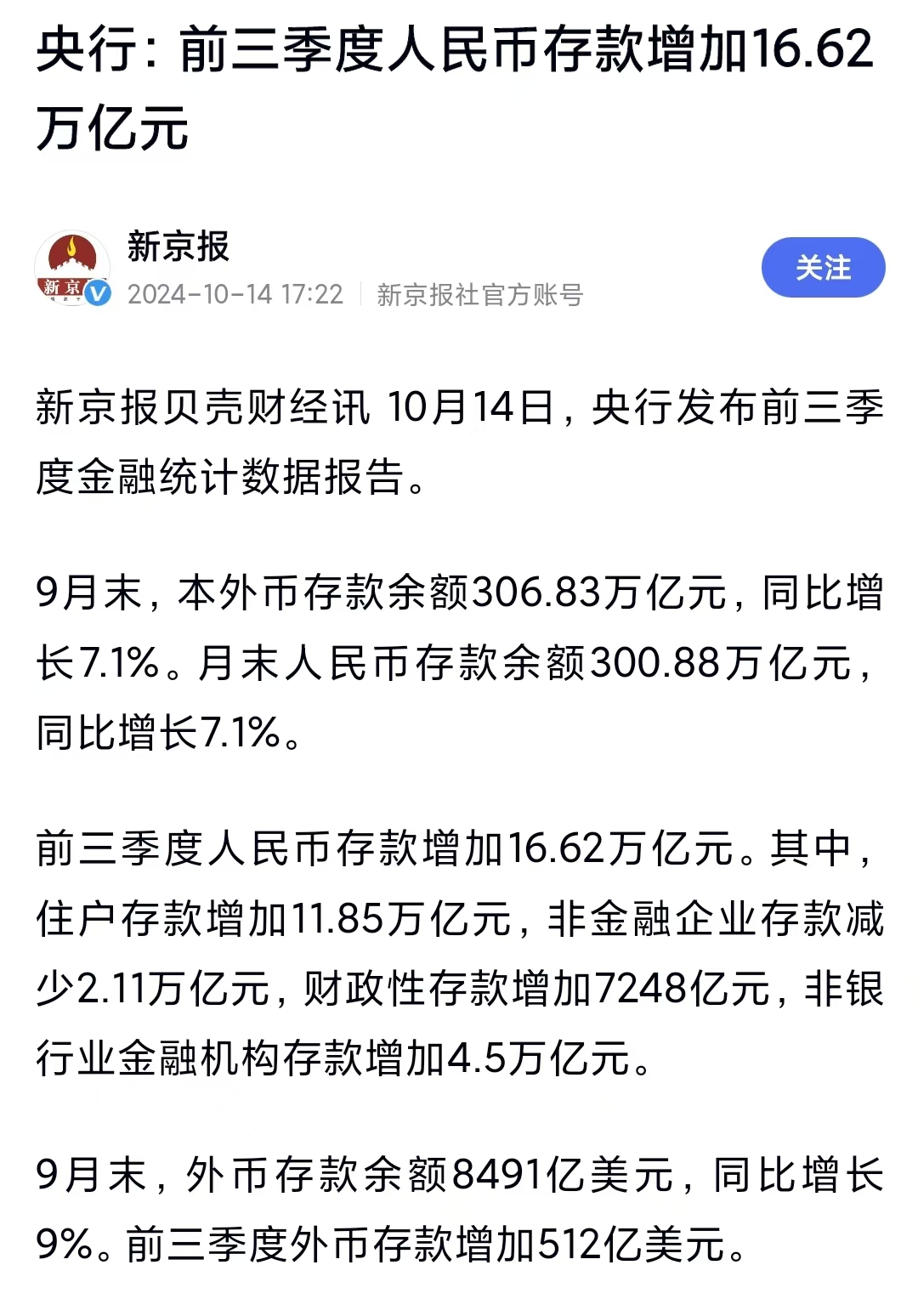 9. 現在已經有跡象了,前三季度,“非銀行金融企業”存款增加4.5萬億,這是券商保證金增加了,進股市的錢明顯增加。住户存款增加11.85萬億,還在不停存錢,這個數據扭過來就好了。無論主動被動,居民存款必須出來,起碼不要增加這麼多。勢頭扭轉,萬點牛市就是必然的,沒地承載這麼多錢,房地產也不行。