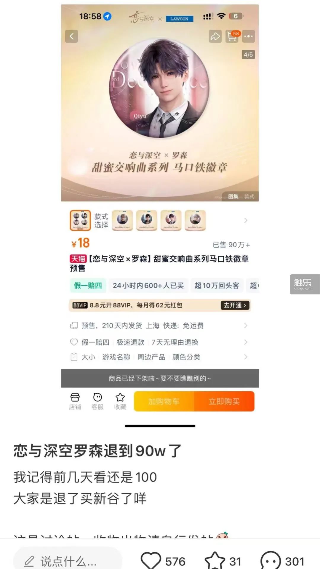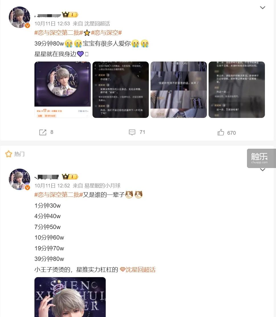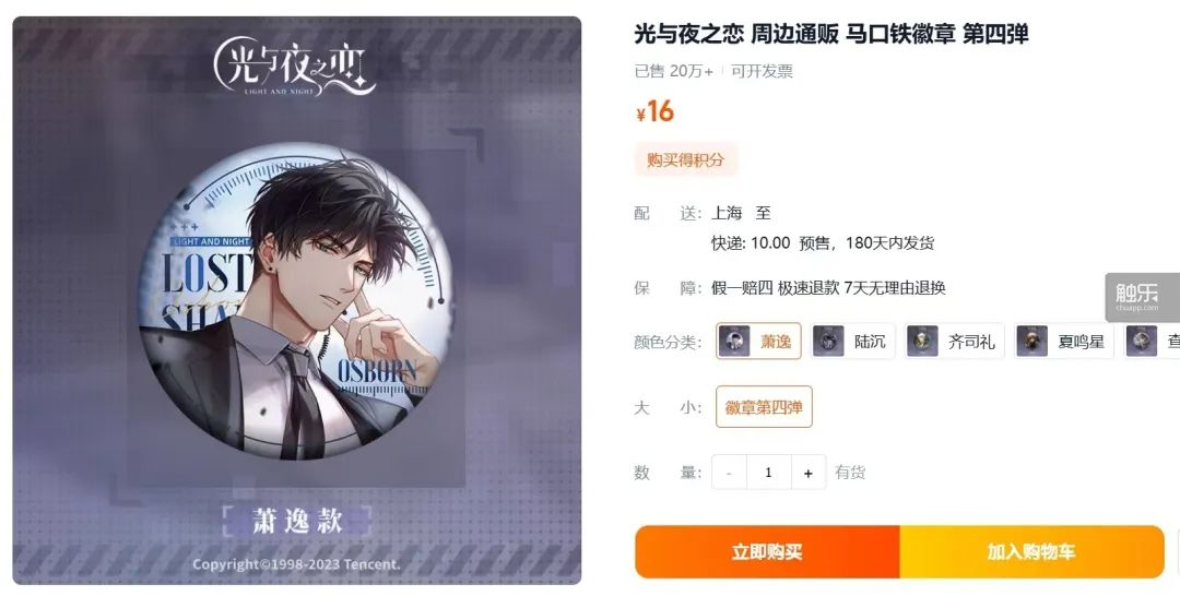 這條路徑很大程度依賴於玩家的消費心理,和國乙持續長久的社區生態。儘管玩家們大多表示不想捲入到哪位男主角的吧唧最先售罄、哪位男主角的單人周邊銷量更高的對比之中,但她們依然會在一些時刻相信:店鋪頁面上不斷跳動的銷量數字確有其價值——比如可以表現人氣的高低、換取更多的官方話語權,甚至成為一種“愛的證明”。