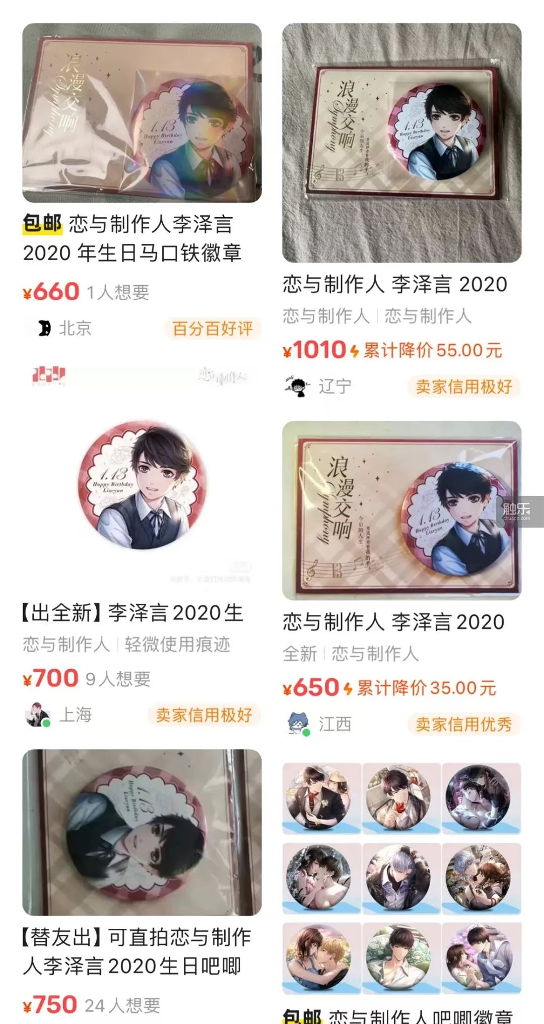 在二級市場上,《戀與製作人》男主角李澤言的2020年生日徽章已經被“炒”到了每枚600元左右,其他遊戲的“絕版”周邊也或多或少地被抬至高價。在這種情況下,玩家們難免產生“錯過了就要高價買”的擔憂;二手交易平台上,往往存在黃牛、“倒爺”氾濫的現象。