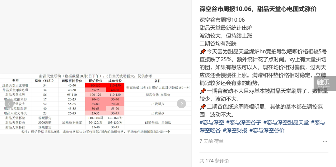 雖然這個故事可能存在一定的誇張成分,這種行為也為大部分玩家所不齒,但不得不承認,在國乙谷圈,類似的現象並不少見。漫長的預售制讓不少消費者微妙地產生了一種接近“買股”的心理。即使是現在,你仍然可以搜到“《戀與深空》本週谷價漲勢圖”一類的表格。