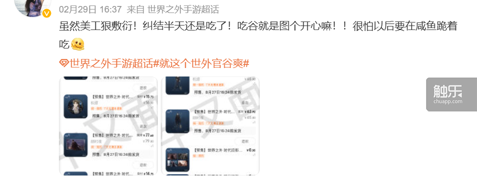 正因如此,儘管遊戲本身似乎熱度更高,但從周邊銷售情況來説,《世界之外》和同屬網易旗下的《時空中的繪旅人》相比是落於下風的。造成這種現象,除卻周邊本身的品質,其用户羣體的特殊性也是重要的原因——比起其他國乙,《世界之外》的玩家羣體更加垂直、接近於網文受眾,在周邊的熱情和需求上相對有限。