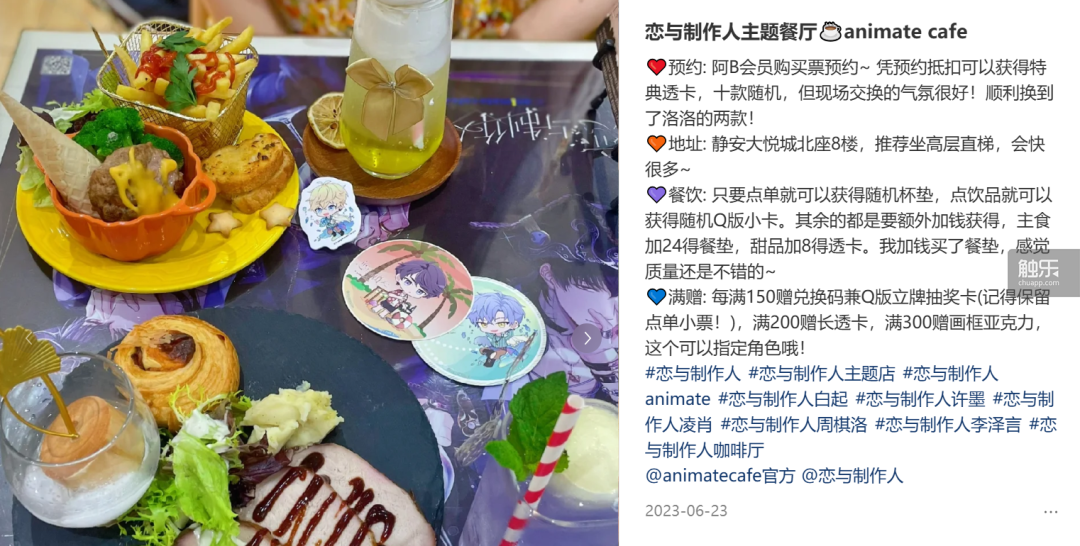 2023年6月,《戀與製作人》與上海Animate Café的聯動取得了不錯的評價。在日本,Animate Café會與動畫、遊戲作品合作展開咖啡廳企劃,在咖啡廳內會推出和作品有關的原創餐品和限定周邊,亦是一套已經成熟、相對固定的周邊線下販售場景——儘管玩家對咖啡廳的餐品、價格和周邊的盲抽機制存在一定不滿,但總體來説,門店氛圍稱得上舒適。有玩家説:“體驗特別好,線下的夫人(《戀與製作人》玩家之間的親暱稱呼)都很温柔!線下是會上癮的。”