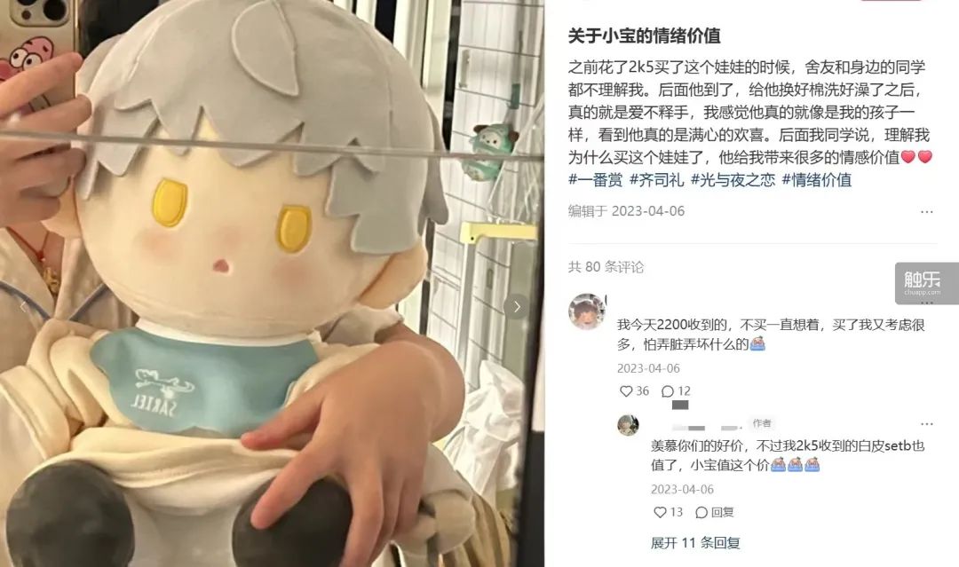 值得一提的是,這些有關情感價值的討論往往與國乙玩家們的社區活動相輔相成。更早之前,《光與夜之戀》與日本娛樂公司萬代合作推出“一番賞娃”。宣傳早期由於定價較高、抽取難度較大,玩家的購買慾望尚不強烈。但在商品發售後,由於娃娃本身體型較大、造型可愛,並且可以進行多方面的裝扮,很多玩家開始真實地將娃娃當成“孩子”來“養”,並在社交媒體上持續進行二創:照顧娃娃、為娃娃換裝、用娃娃演情景劇,乃至分享自己通過娃娃獲得的安慰或鼓勵。