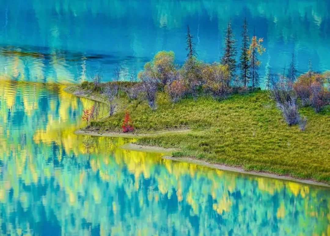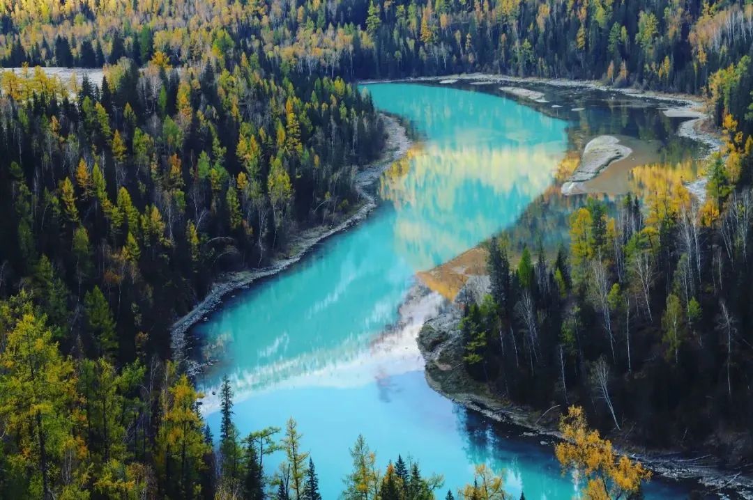 如果説布爾津是一首詩,那麼喀納斯就是一幅圖,每每到了秋季,一彎湖水呈深藍色,兩岸金黃色的樺樹葉、杏黃色的落葉松,火紅的歐洲山楊、四季常青的松柏兩兩對立,如無數個梵高在揮毫作畫。
