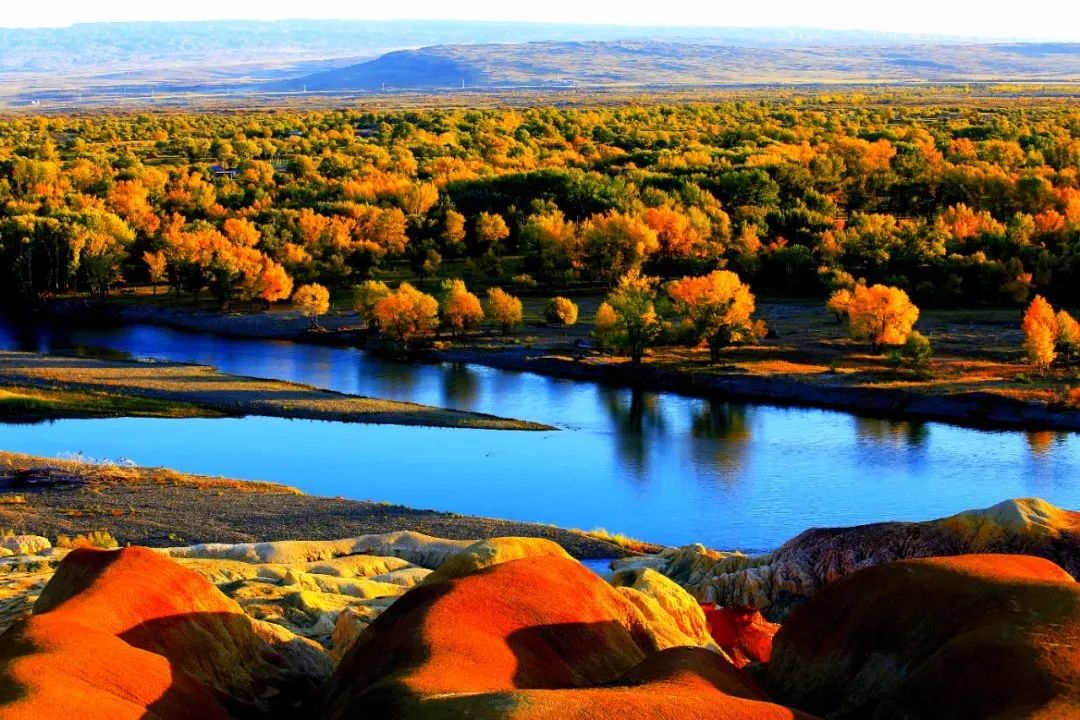 遙望額爾齊斯河,那對岸的五彩灘溝壑縱橫和鬱鬱葱葱的河谷風光遙相輝映,形成一河隔兩岸,自有兩重天的盛景。