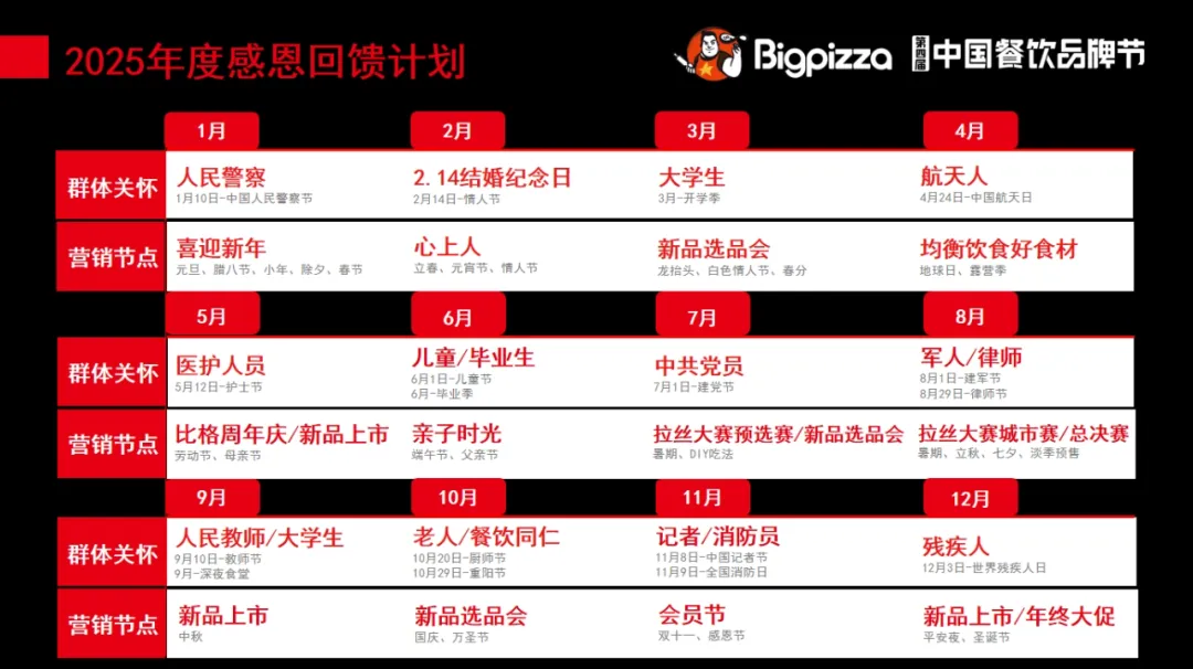 最後,也跟大家分享下,我們2025年度的感恩回饋活動表已經出來了,其中包含對各個階層的感恩回饋,像1月10日的人民警察節,推出39.9塊的福利價格,2月14日憑着當天結婚的結婚證給予福利……