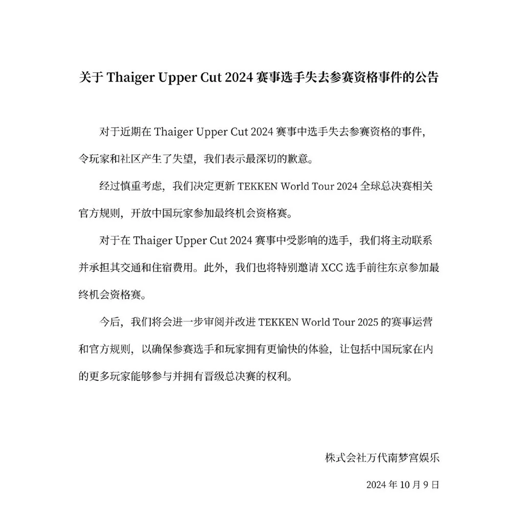 10月9日,該遊戲製作發行方萬代南夢宮中國官方發文,回應關於Thaiger UpperCut 2024 賽事選手失去參賽資格事件,並且萬代南夢宮電子競技海外官推也發佈同樣公告。
