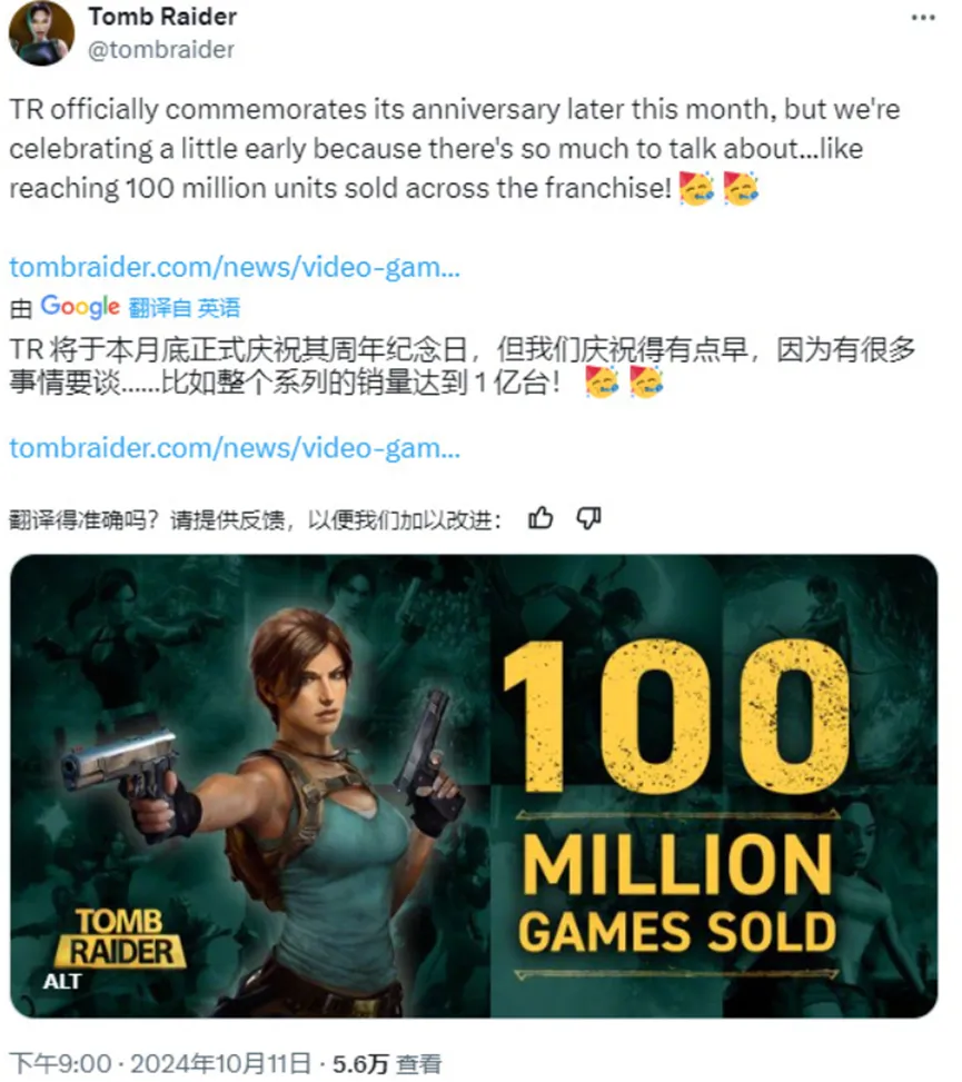 水晶動力官推宣佈,1996年發行的古墓麗影系列遊戲合計銷量已經突破1億份。