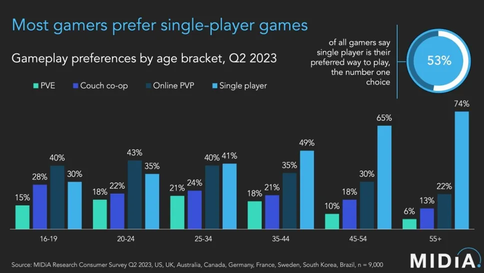 根據英國市場研究機構MIDiA Research發佈的《The single-player opportunity》報告指出,玩家對遊戲類型的偏好隨年齡變化顯著。對於35至44歲的玩家而言,約一半更喜歡獨自享受遊戲的樂趣;在55歲以上人羣中,該比例高達74%。整體上,超過半數(53%)的受訪者表示更傾向於單人遊戲體驗。