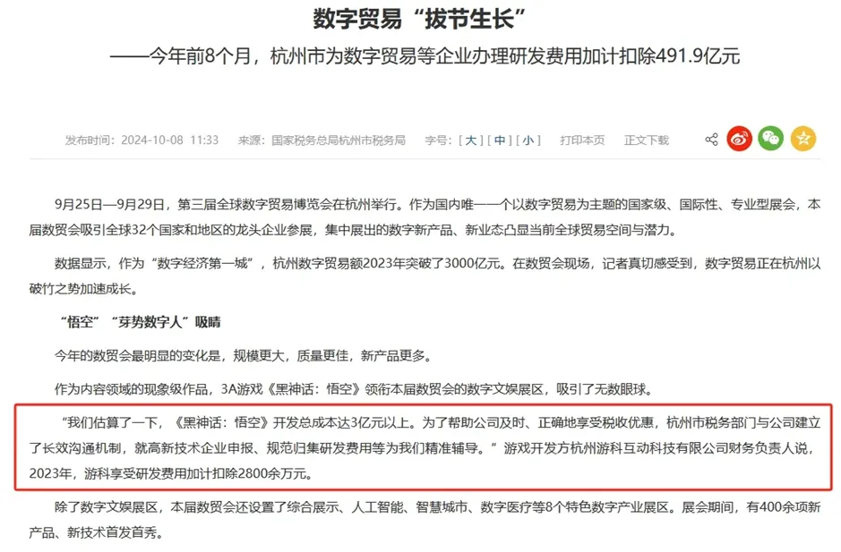 杭州税務局確認《黑神話:悟空》開發總成本3億元