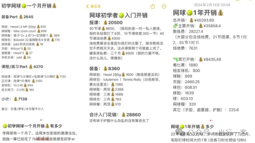 小紅書博主分享的初學網球開銷 圖源:小紅書截圖