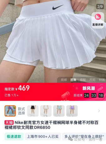 唯品會數據顯示,7月以來平台網球裙銷量同比增長91%。淘寶上,鄭欽文同款的網球裙成為熱門搜索,價格469元的Nike“鄭欽文同款”網球裙,截至10月12日銷量已突破一萬件。