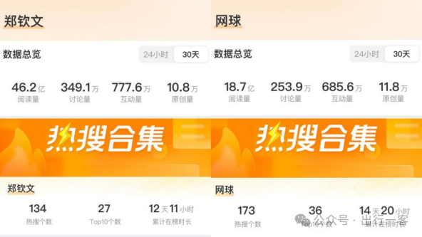截至發文30天內微博“鄭欽文”“網球”詞條數據總覽