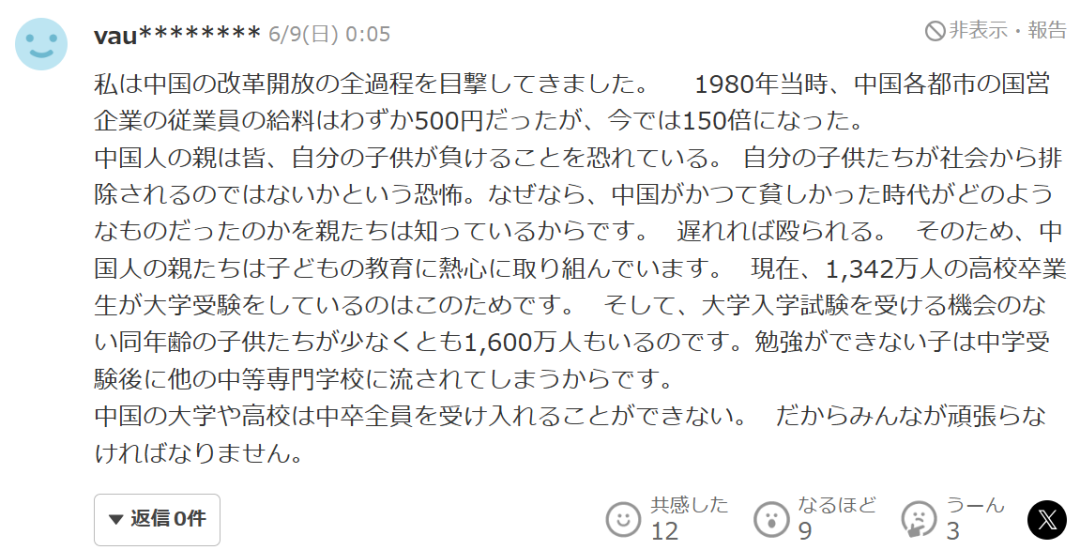 我見證了中國改革開放的整個過程。1980年中國國營企業員工的工資僅為500日元,但如今工資已經上漲了150倍。所有的父母都害怕自己的孩子失敗,擔心孩子被社會排斥在外。因為父母知道中國窮的時候是什麼樣子,落後就得捱打。所以中國家長在孩子教育上下了不少功夫,這就是為什麼目前有1342萬高中畢業正在參加高考,而至少還有1600萬的同齡孩子沒有機會參加高考,這是因為,不喜歡學習的孩子在中學畢業後就會被送往其他中等職業學校。中國的大學和高中不能接收所有的初中畢業生,所以每個人都必須盡力而為。